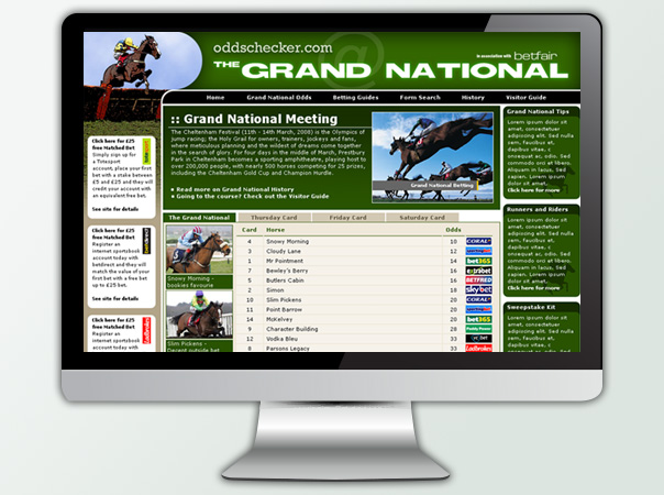 In addition to owning all UX and UI journeys, I designed and built prototypes for the company's first mobile apps for iOS devices. I was also the creative director on all promotional microsites, including the Grand National, Cheltenham Festival, World Cup sites and Oddschecker’s mobile portal, and designed white label co-brands for external clients, including the Guardian, Channel Four, Virgin Media, At The Races and the Daily Mail.